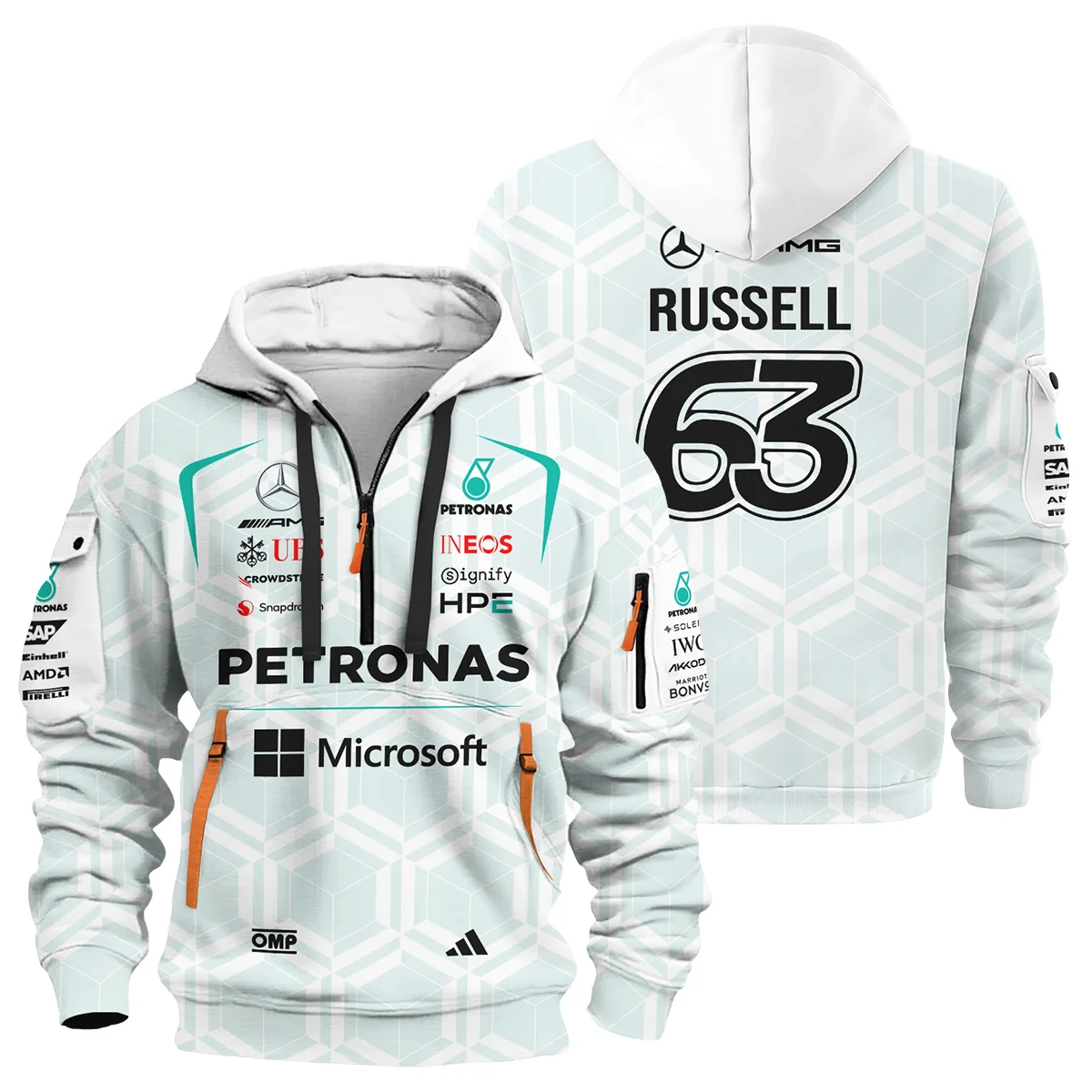 2026 George Russell Mercedes F1 Teamwear Hoodie Half Zip Unisex Motorsport Apparel BLGR30326A2HDF – White