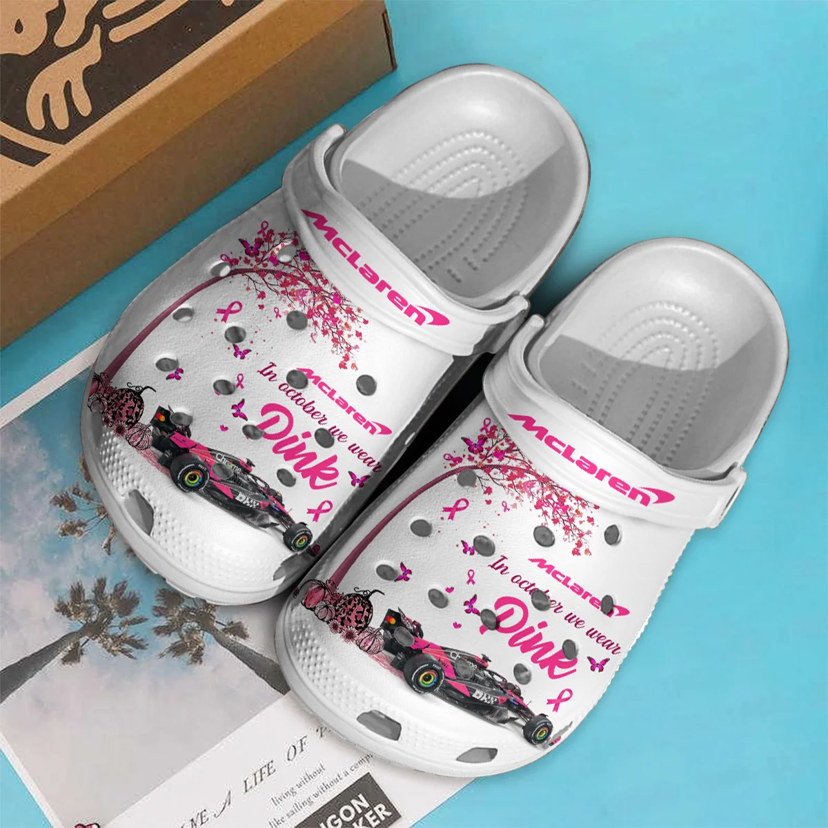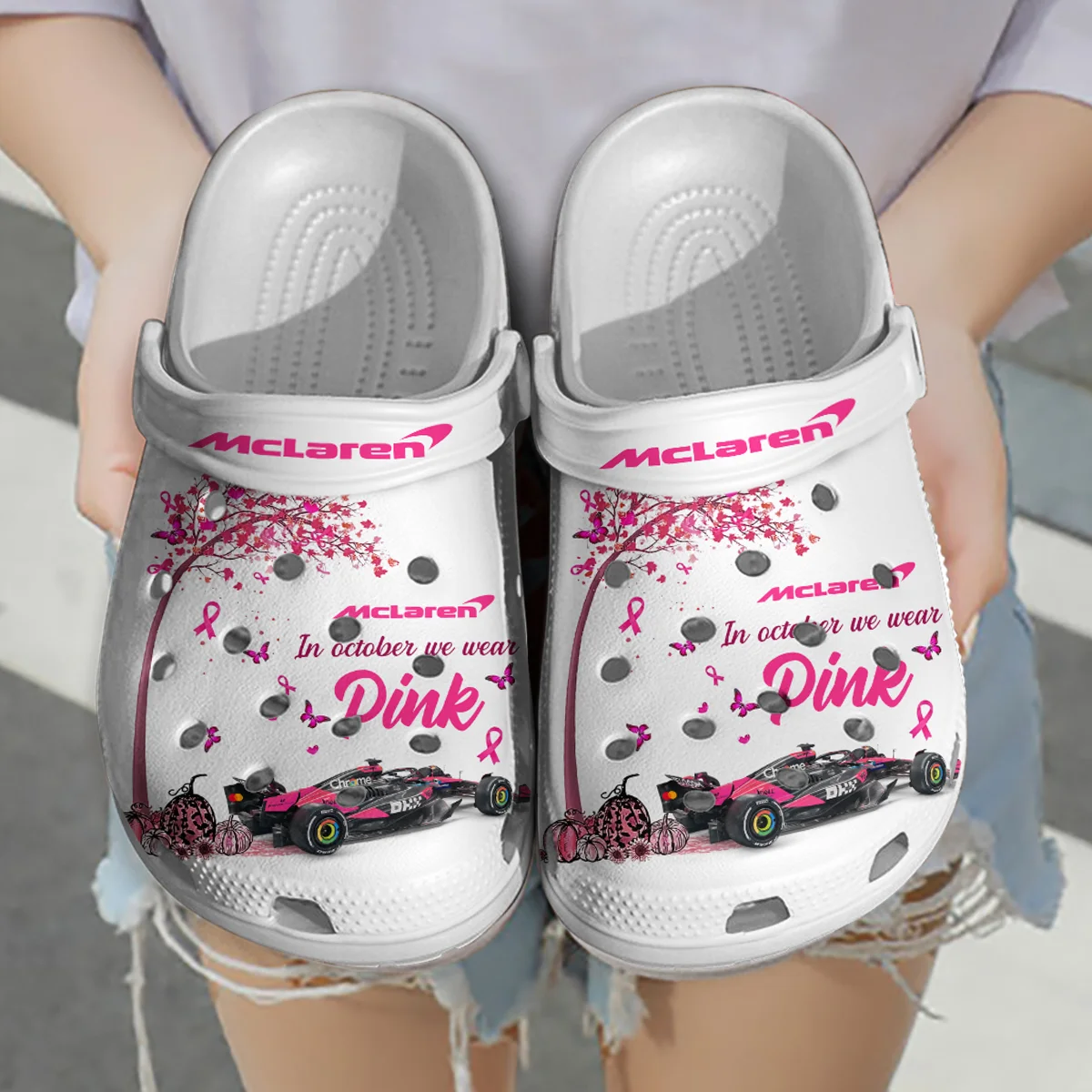 In October We Wear Pink McLaren Crocs – Waterproof Odor-resistant Antimicrobial Unisex Motorsport Apparel BLMCL7925A1CROC
